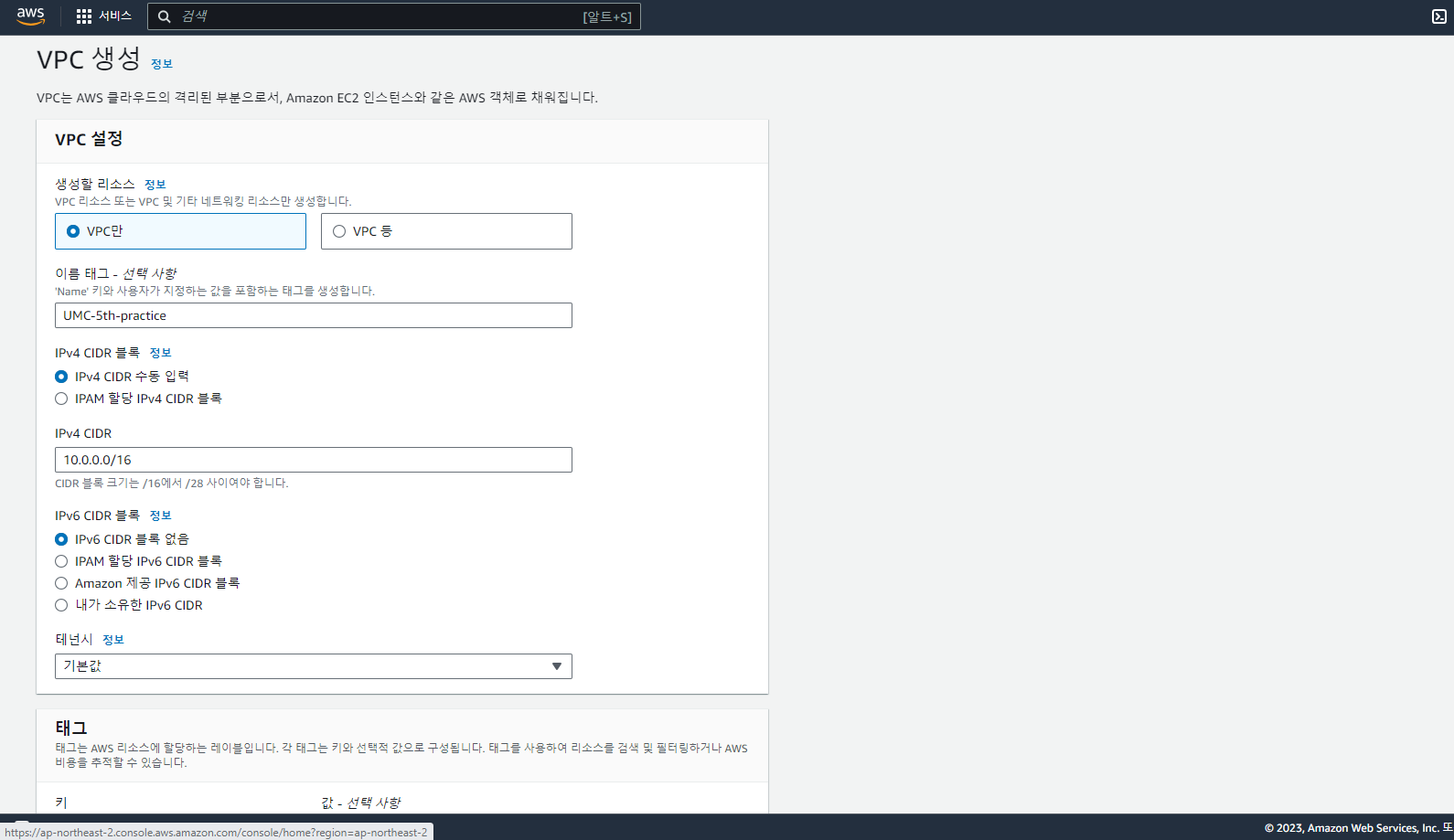 다음으로 VPC 생성 설정을 다음과 같이 완료한다.