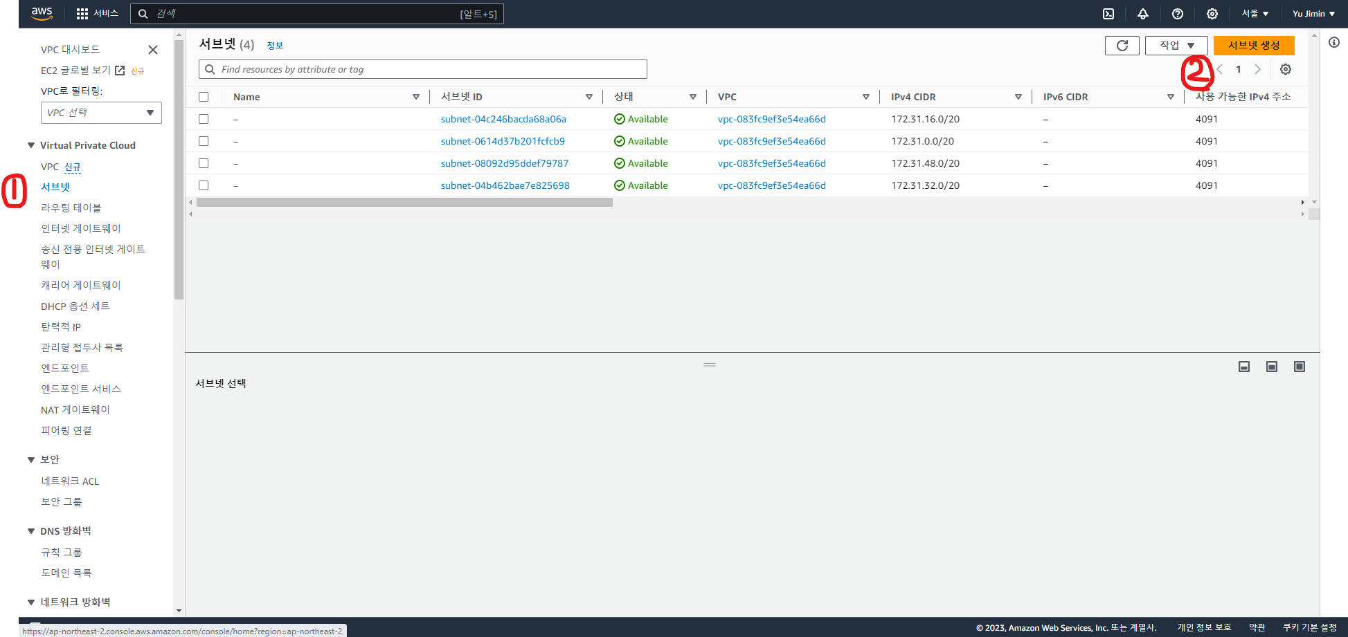 또한 서브넷은 각각 가용영역 한개를 할당하는 것을 볼 수 있다.