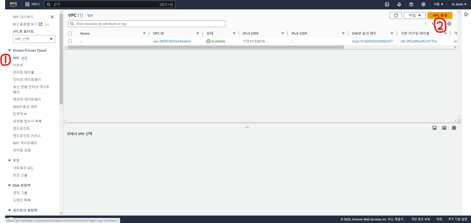 먼저 AWS에서 로그인 한 후, 검색창에 VPC를 입력하여 들어온다.