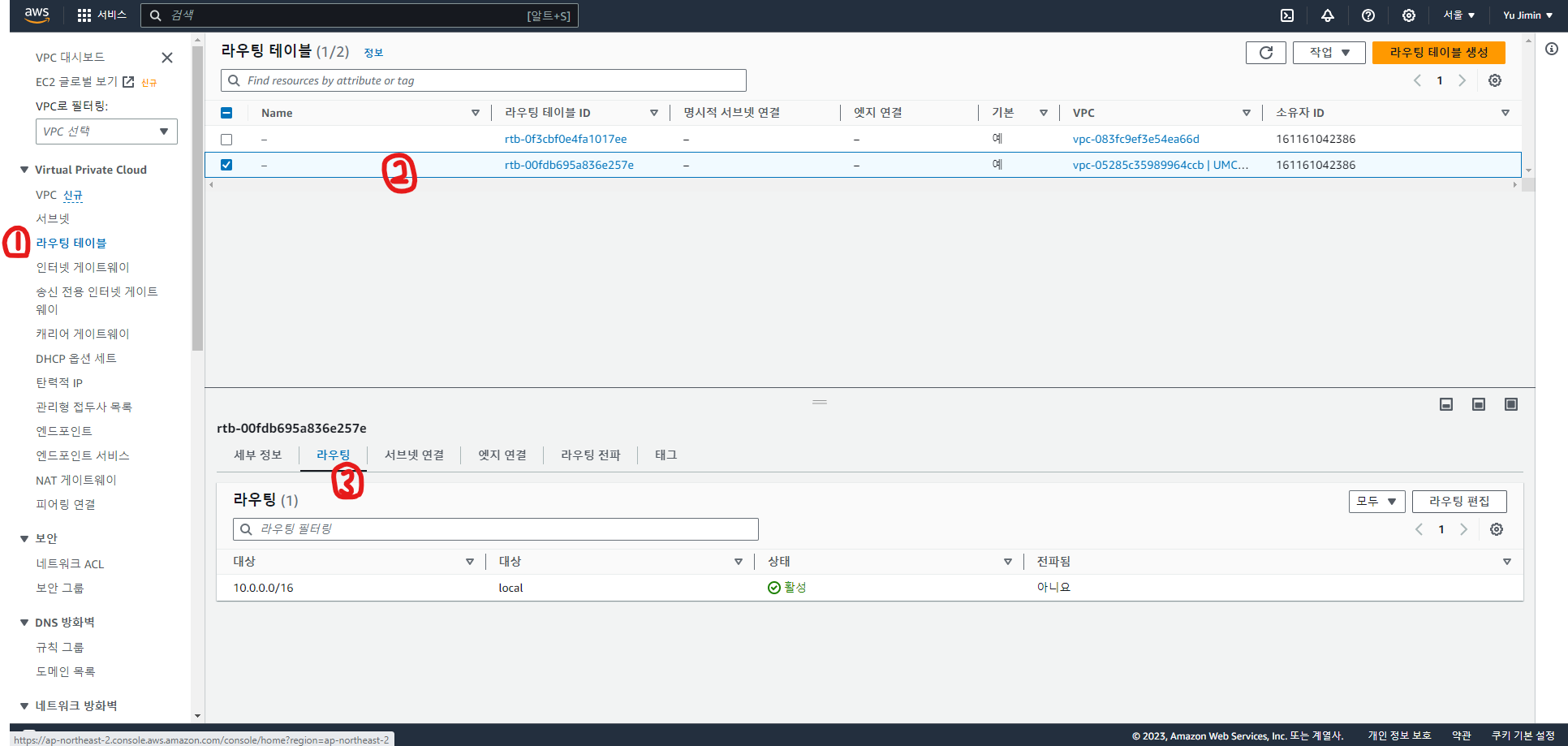 아래와 같이 라우팅 테이블 > 해당되는 VPC 클릭 > 라우팅 버튼을 누른다