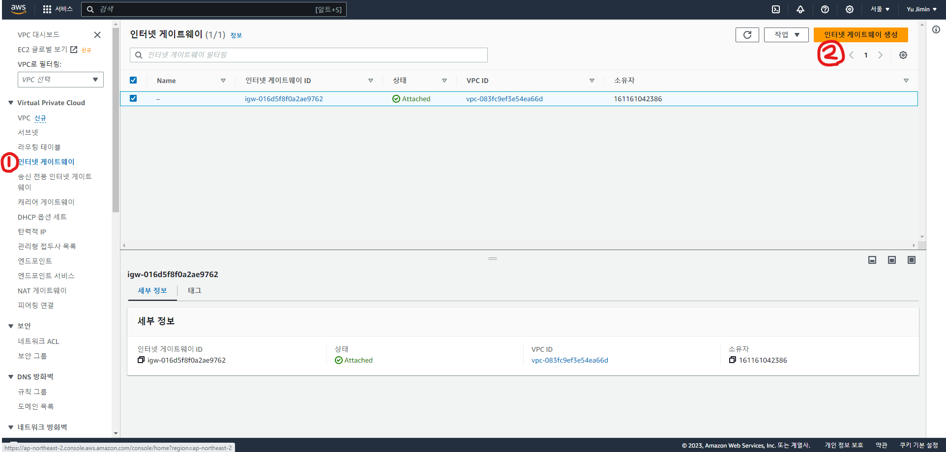 상단의 인터넷 게이트웨이 생성 버튼을 클릭한다.
