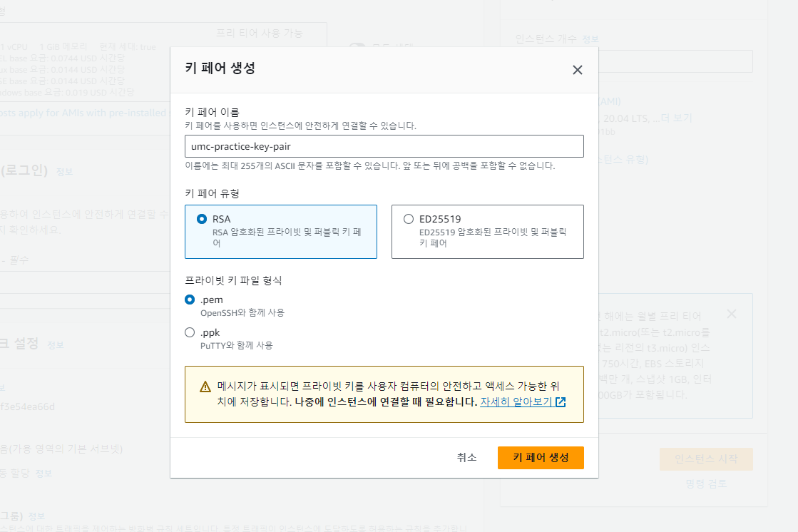 4) 키페어 : 키페어가 없는 경우 새 키 페어 생성한 후 설정 (아래 사진 참고)
