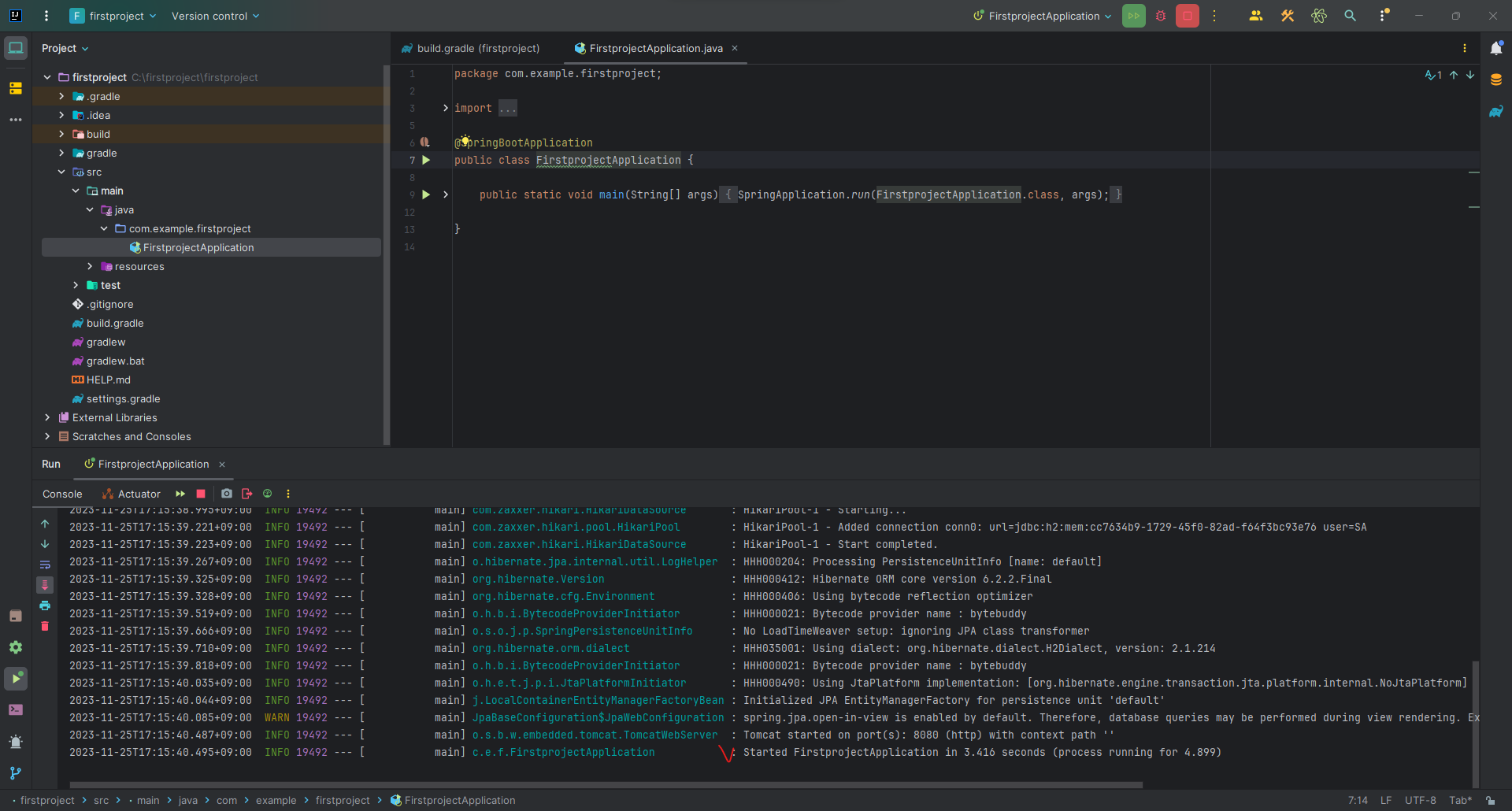 main > java > com.example.firstproject > FirstProjectApplication 클래스를 실행한 후,
