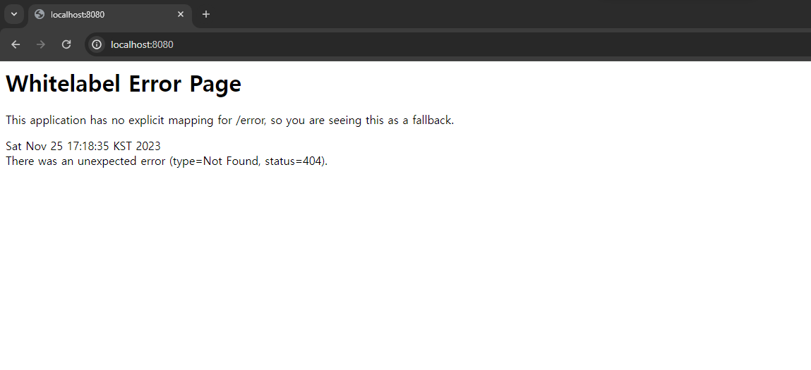 아래와 같은 Error 페이지가 뜨는 것을 확인할 수 있다.