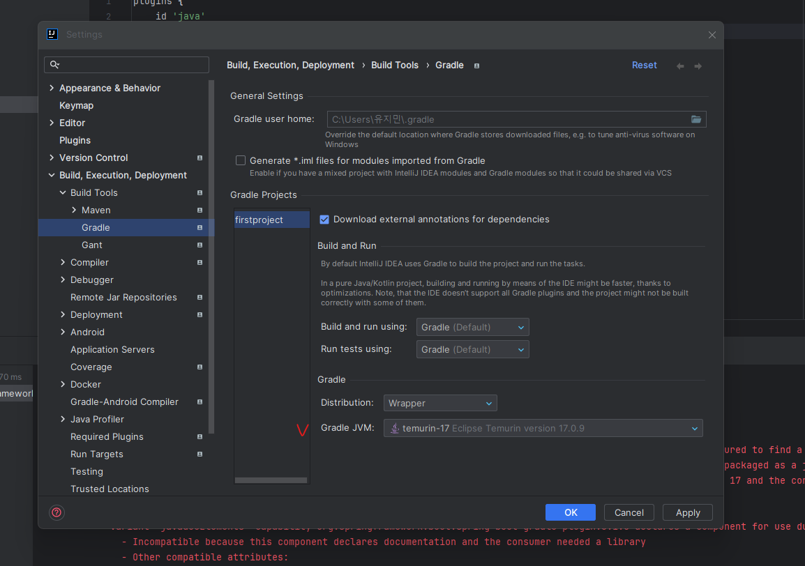 이후 File > Settings > Build, Execution, Deployment > Gradle 에서