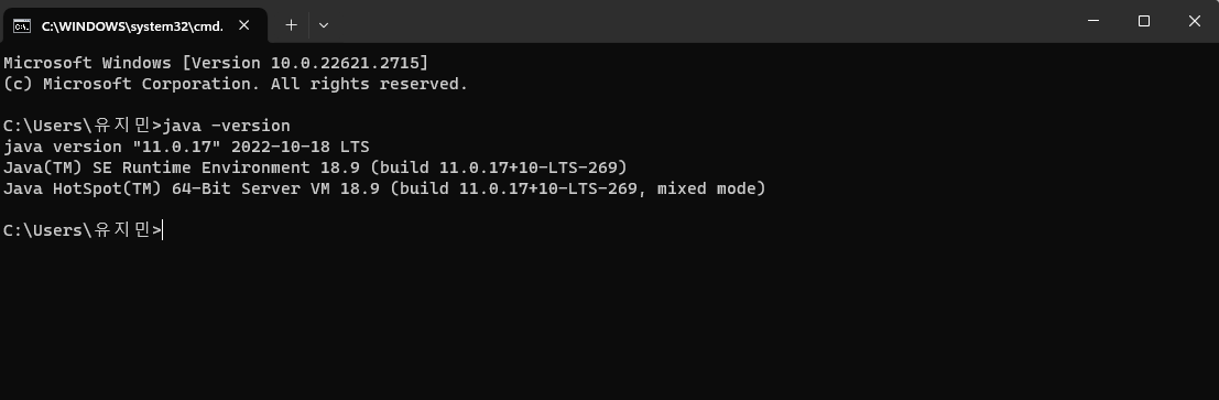 다시 cmd 창에서 'java -version' 을 확인해보면, OpenJDK 17 설치가 완료된 것을 확인할 수 있다.