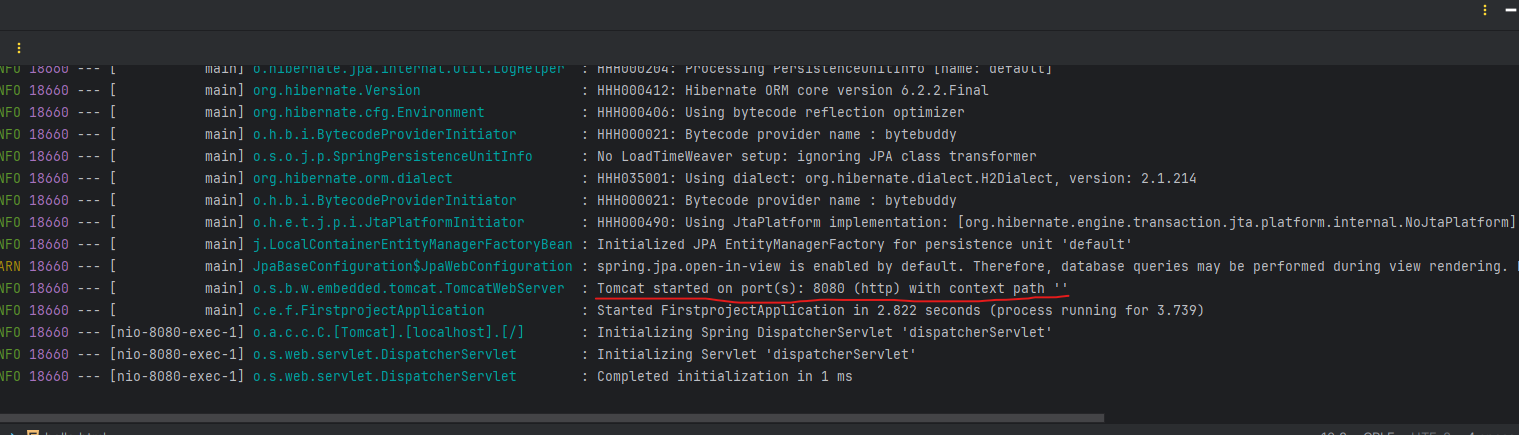 아래와 같이 "Started FirstprojectApplication" 문구가 뜨면 서버 실행이 완료된 것이다.