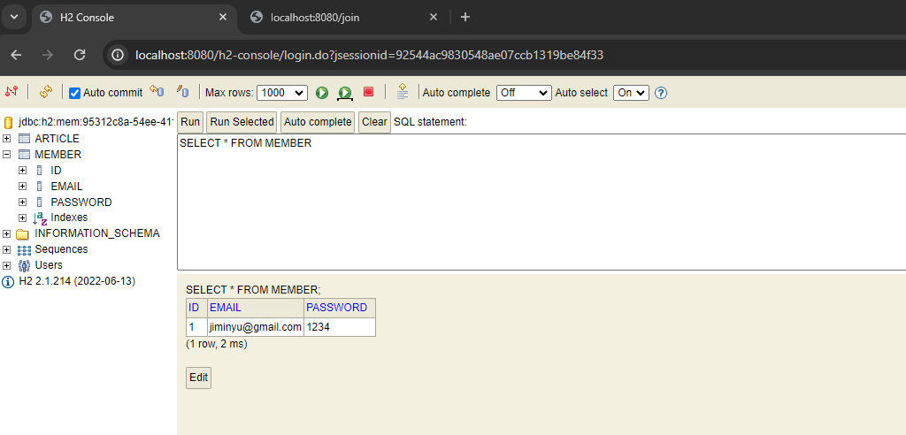 H2 데이터베이스에 접속하여 앞서 생성한 게시글을 조회해보자.