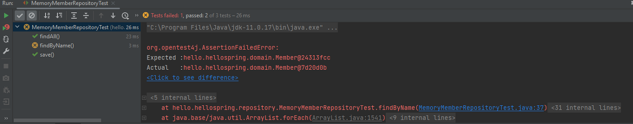 이후 findByName() 메소드의 test 가 실행될 때, 이미 저장되어 있던 spring1 값이 가져와지면서 test가 fail 된다.