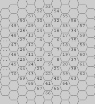 - 1을 중심으로 6의 배수마다 한 겹씩 벌집이 늘어남